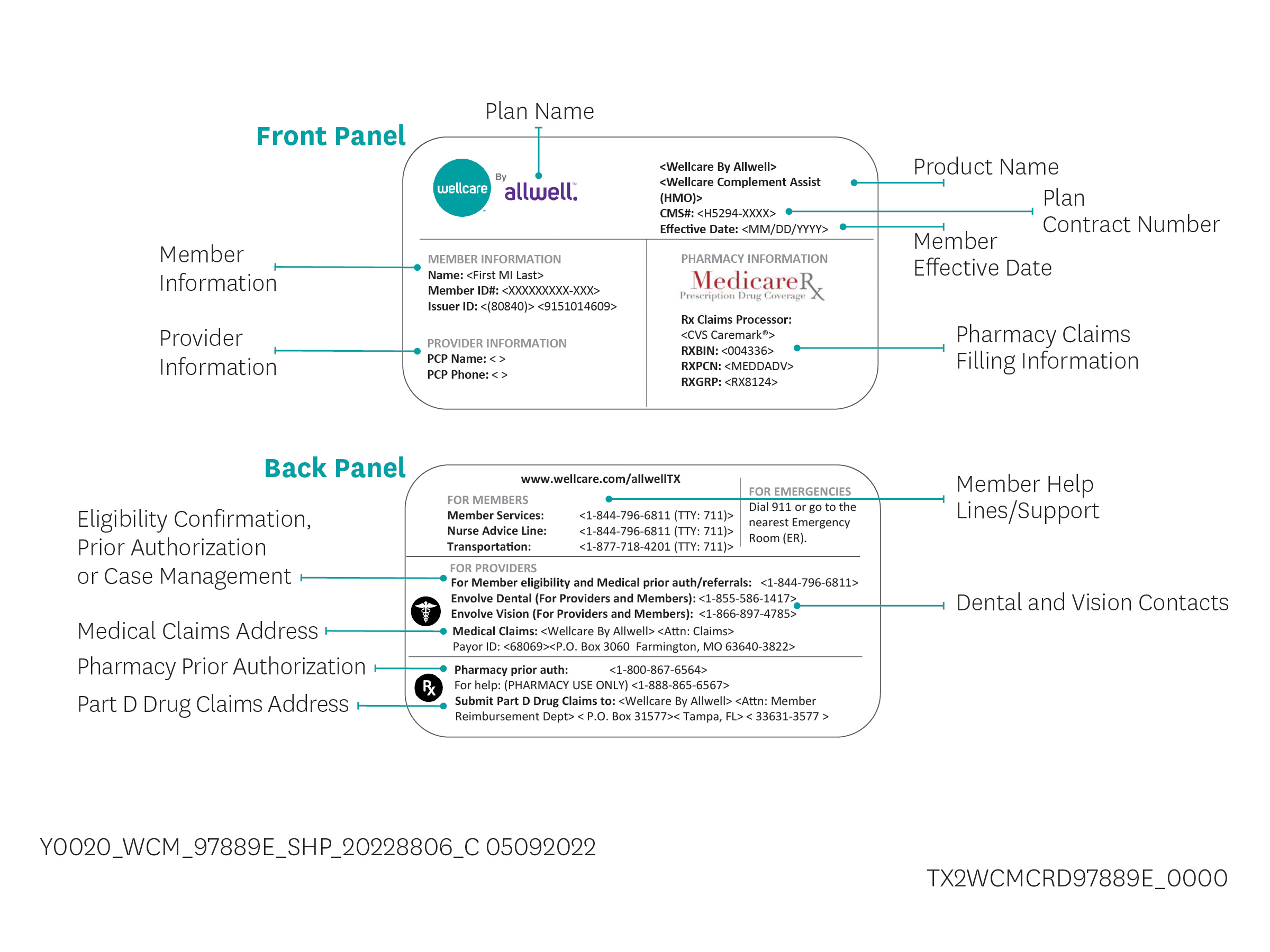 Este es un ejemplo de una tarjeta de identificación de Wellcare por Allwell para ayudarlo a conocer y comprender las diferentes partes de su tarjeta de identificación de afiliado.